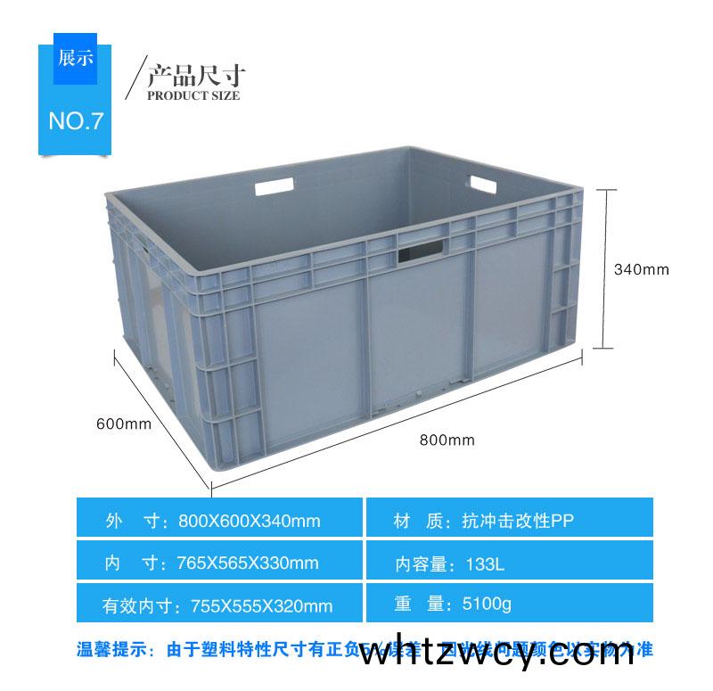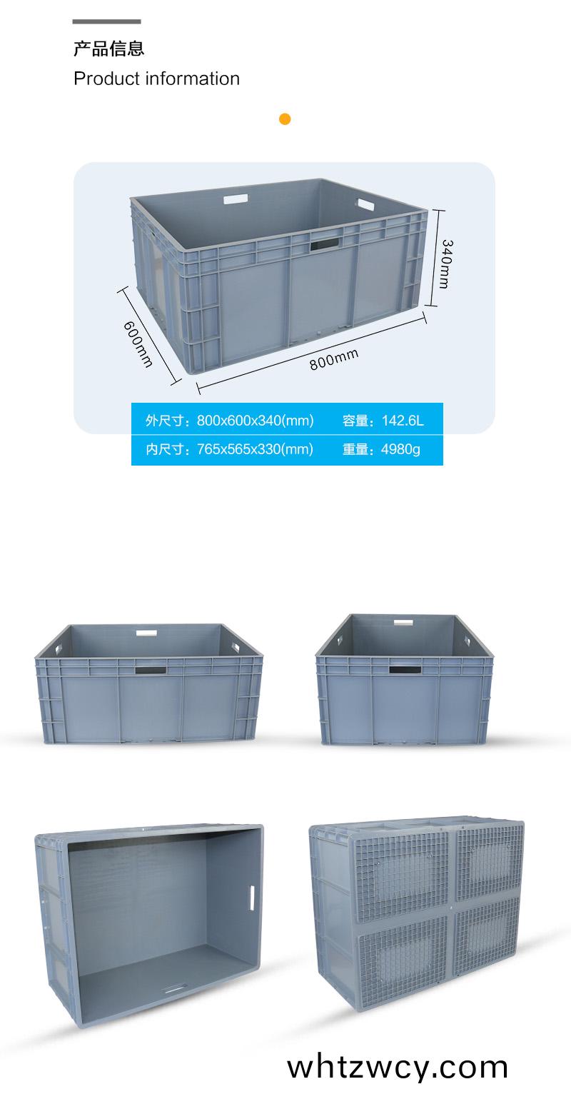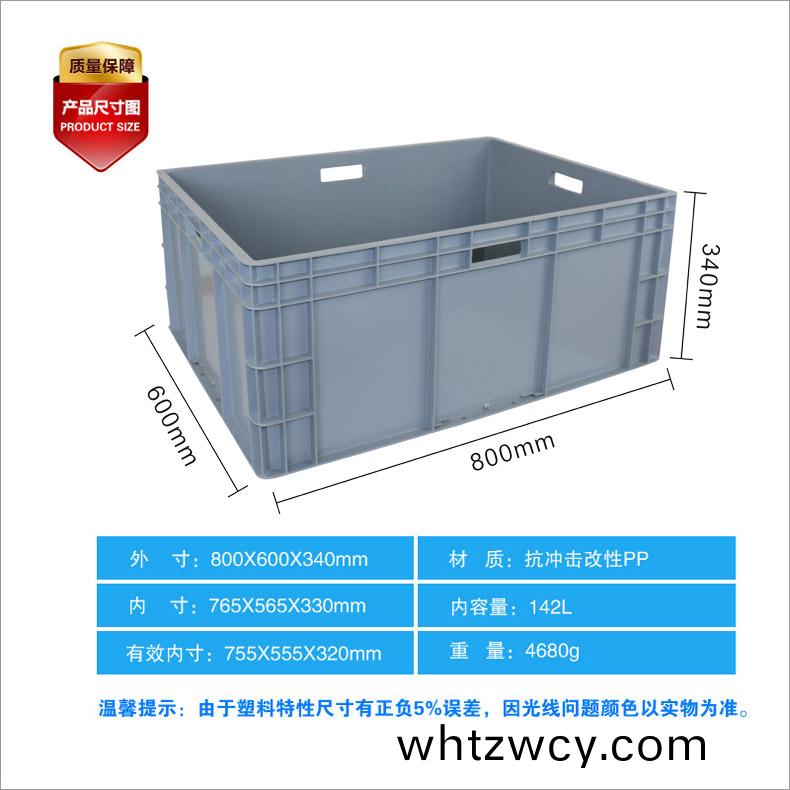 外尺寸:800*600*340mm 內尺寸(cun):765*565*330mm 材質:PP 重量:4580g