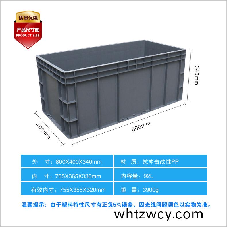 外尺寸:800*400*340mm 內尺寸:765*365*330mm 材質:PP 重量:3700g