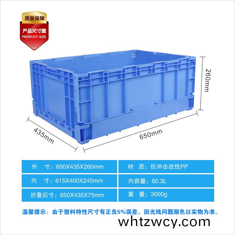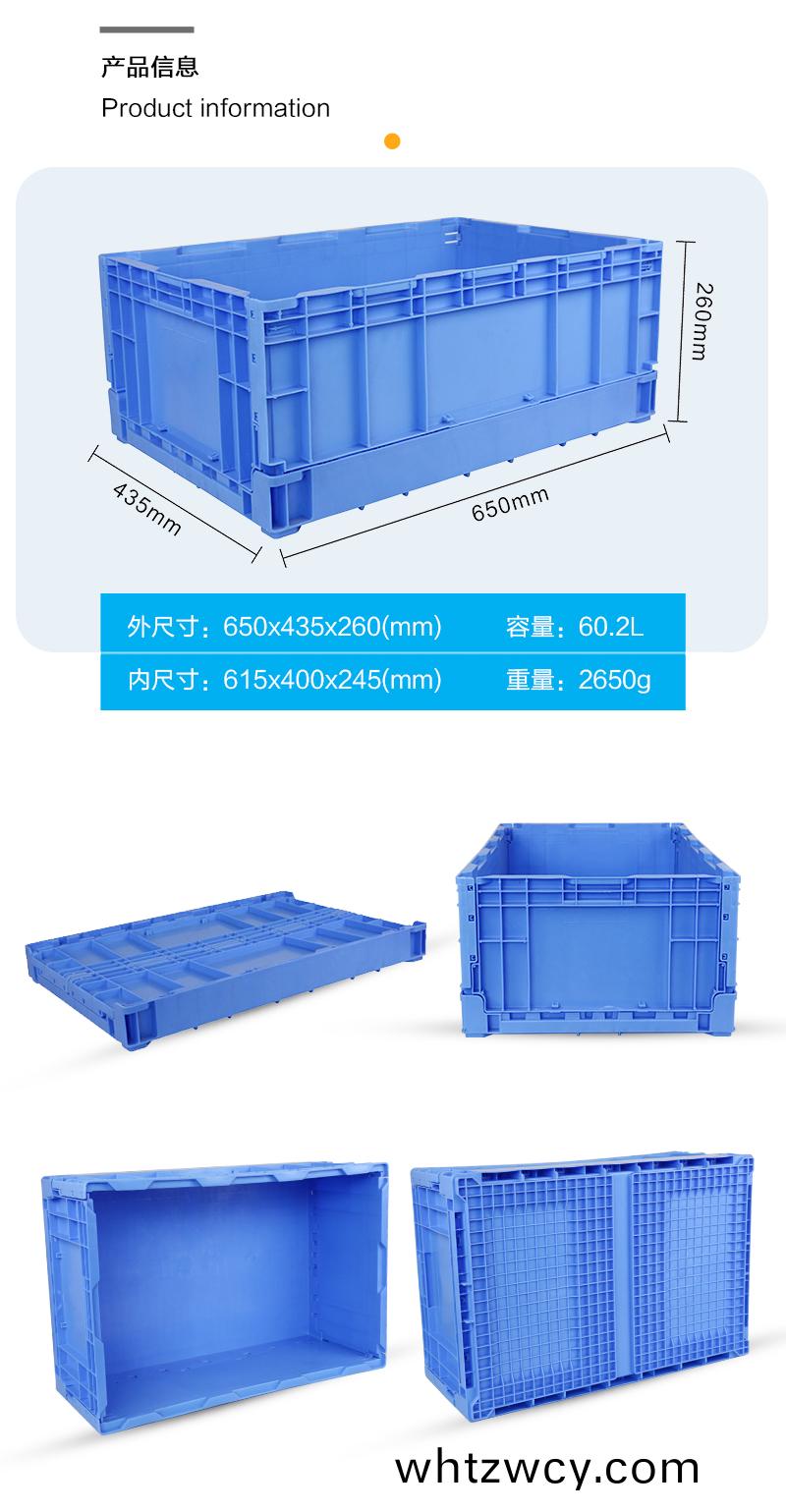 外尺寸(cun):650*435*260mm 內尺寸:615*400*245mm 材質:抗衝擊改性PP 重量:2650g