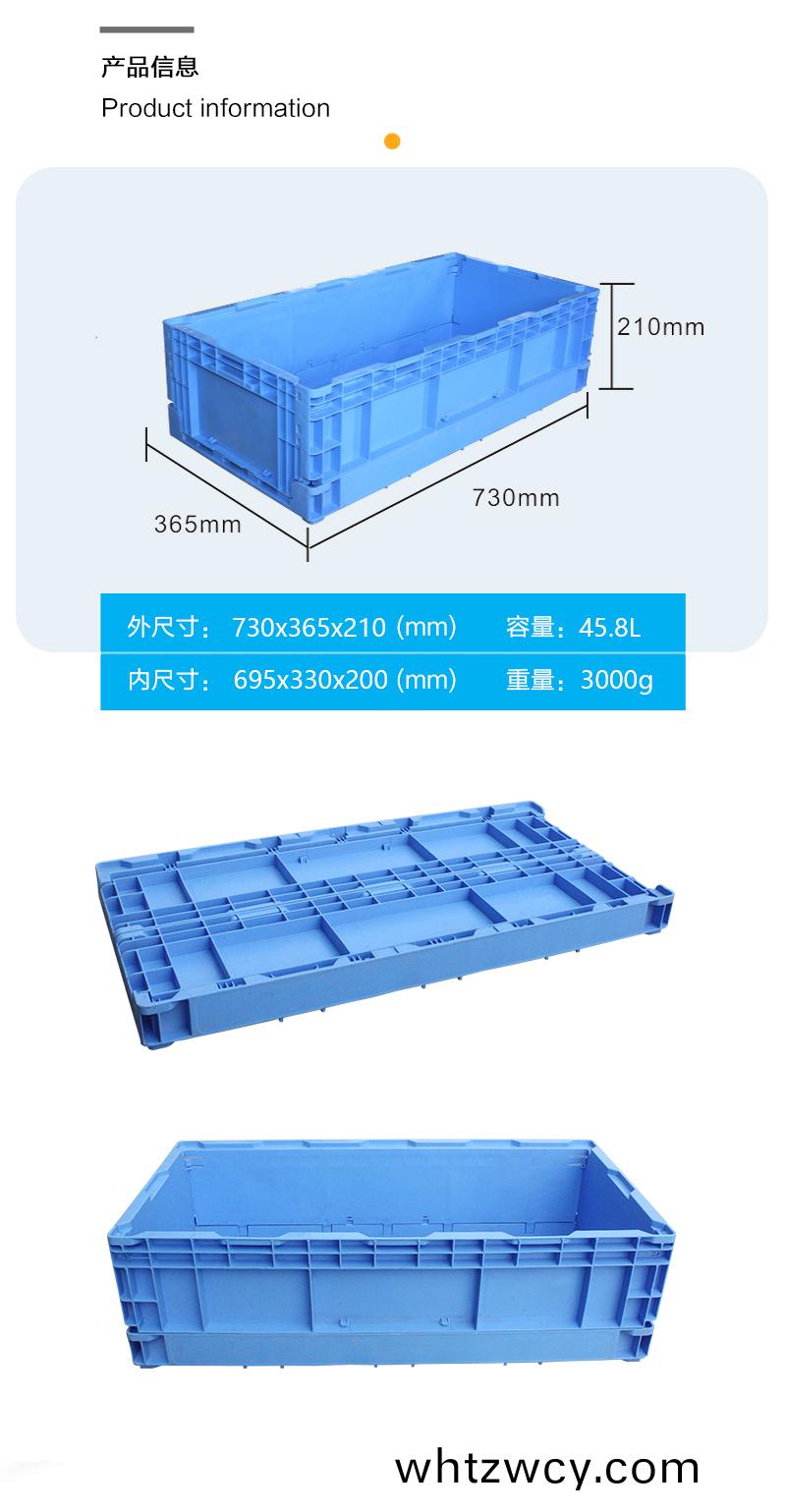 外尺寸:730*365*210mm 內尺寸(cun):695*330*200mm 材質:PP 重量:3000g