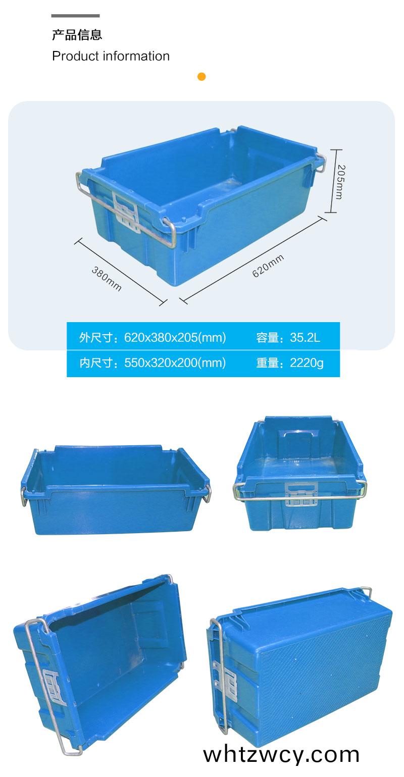 外尺寸:620*380*205mm 內尺寸:550*320*200mm 材質:抗衝擊改性PP 重量:1675g