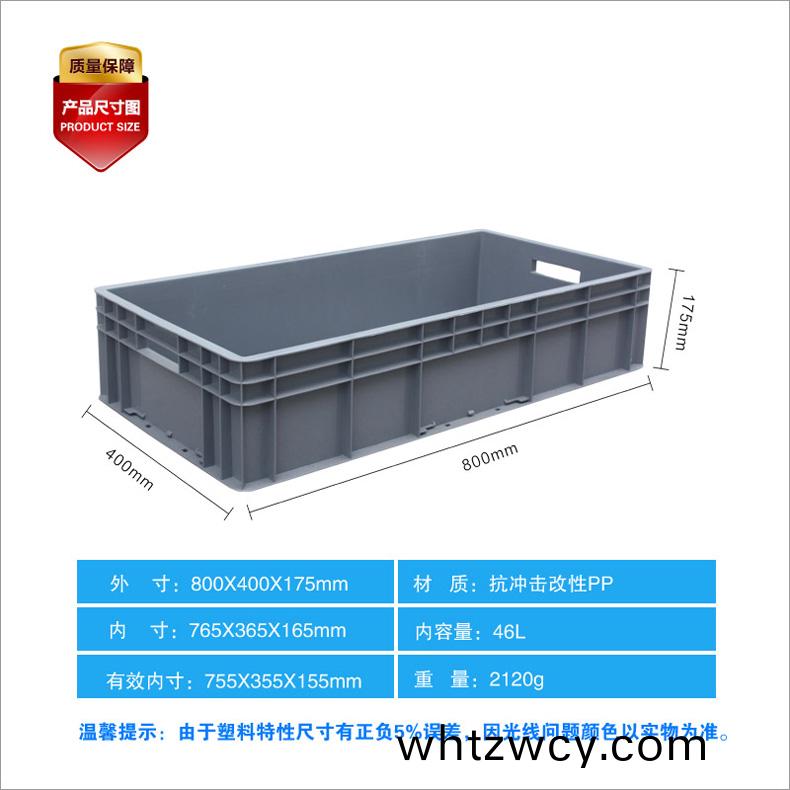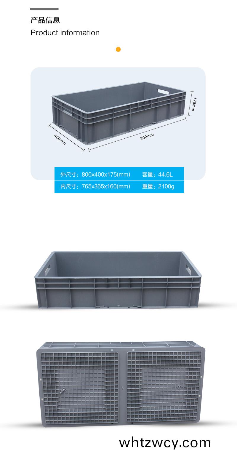 外尺寸:800X400X175mm 內(nei)尺寸:765X365X160mm 材質:抗衝擊改性PP 重量:2.05kg