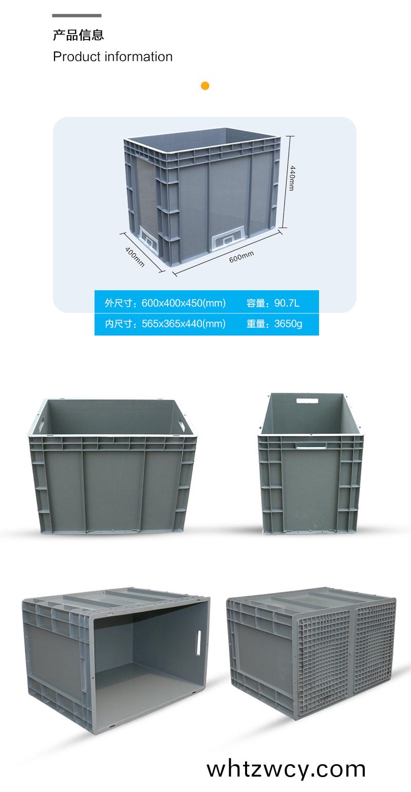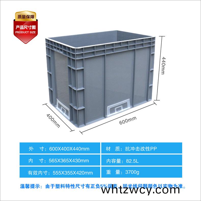外尺寸:600X400X440mm 內尺寸:565X365X430mm 材質:抗衝擊改性(xing)PP 重量:3.6kg